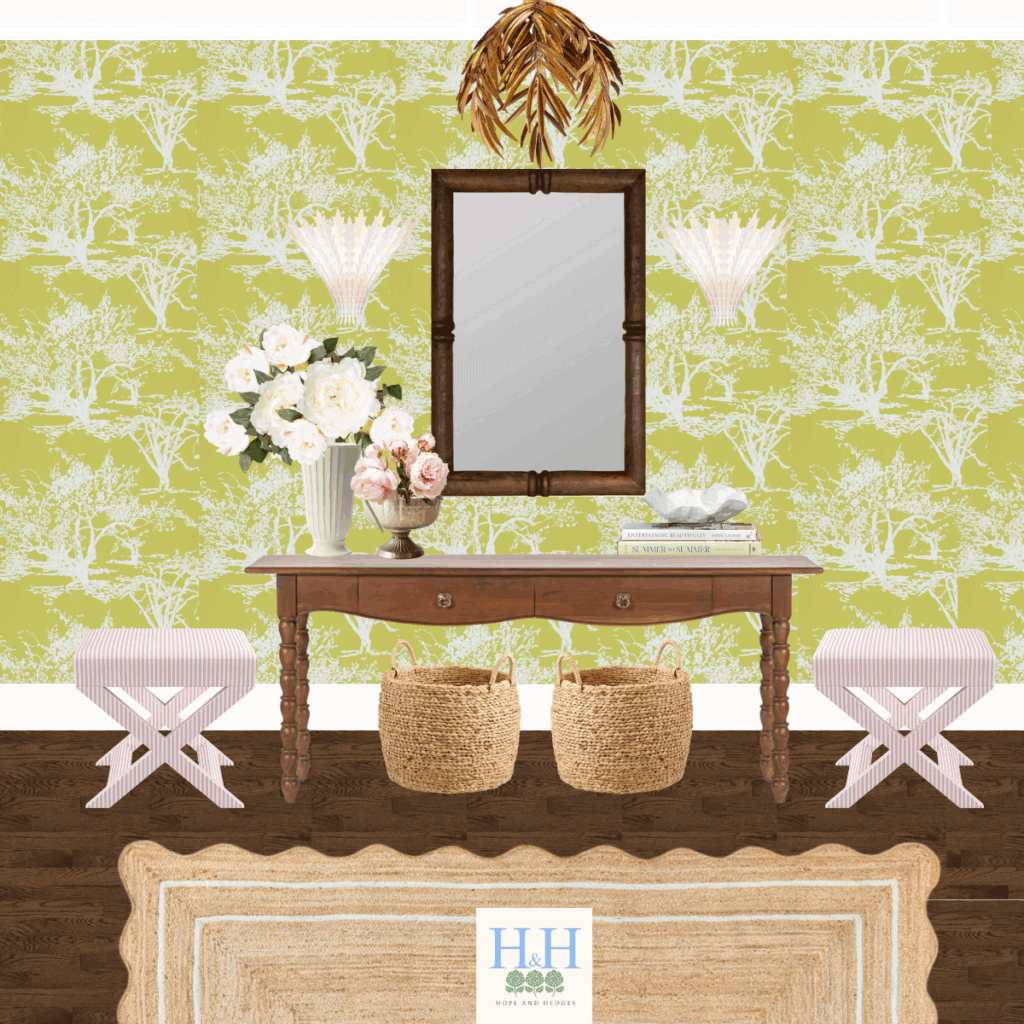 This traditional entryway has the perfect mix of neutral, natural, and versatile elements like the scalloped woven rug (affordable find!!), the wooden console and mirror (I love adding rich wood tones for a traditional space), and the woven water hyacinth baskets, and fun pops of color- with the pretty light pink ticking stripe X benches, the lush faux pink peonies, and of course, the colorful gorgeous apple green wallpaper!